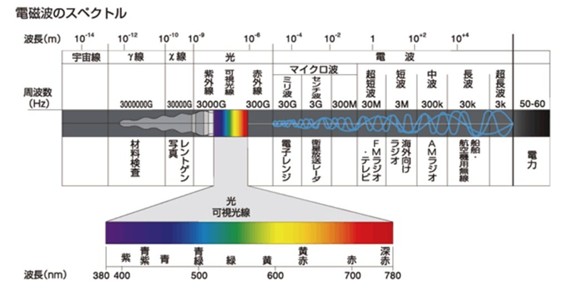 この電磁波一覧の中ほどに、我々にも見える可視光線の波長があります。